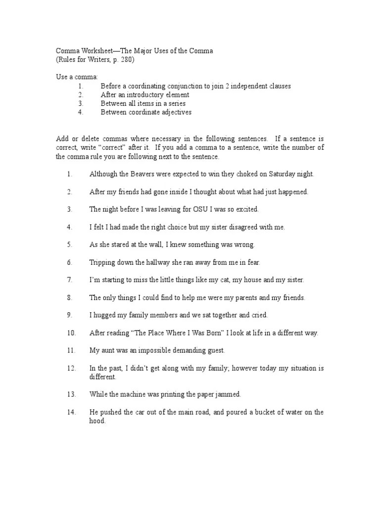 ( using commas to separate items. The "extra practice" worksheet (an answer key is included on the worksheet so students can . Click here to preview the answers for this assignment. Learners will take a deep dive into comma use in this punctuation practice worksheet. Comma usage within sentences in grammar section.
